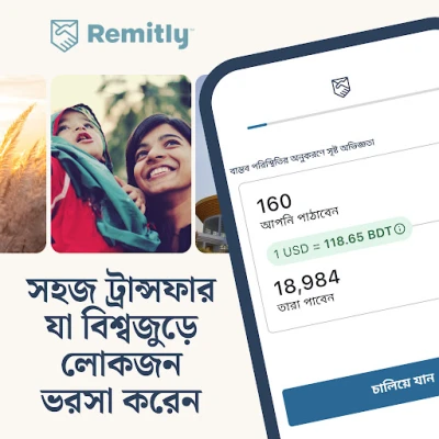 Remitly অ্যাপের মাধ্যমে বিদেশে থাকা পরিবার ও বন্ধুদের কাছে দ্রুত ও নিরাপদে টাকা পাঠান। বিশ্বজুড়ে লক্ষ লক্ষ মানুষের ভরসা এই অ্যাপ। ব্যাংক বা প্রায় 470,000 ক্যাশ পিক-আপ লোকেশনে বিভিন্ন মুদ্রায় টাকা পাঠান। প্রাপকরা বিনা ফিতে ক্যাশ তুলতে পারবেন।