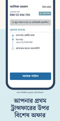 আপনার প্রিয়জনদের কাছে আরও বেশি অর্থ পৌঁছে দিতে Remitly শুধুমাত্র সেরা বিনিময় হারই প্রদান করে না, বরং আপনার প্রথম মানি ট্রান্সফারের জন্য আকর্ষণীয় বিশেষ অফারও নিয়ে আসে। Remitly-এর স্বচ্ছ নীতিতে কোনো লুকানো ফি নেই, যা আপনাকে মানসিক শান্তি দেয়। Remitly আপনার আন্তর্জাতিক অর্থ লেনদেনকে করে তোলে সহজ, দ্রুত এবং নির্ভরযোগ্য, নিশ্চিত করে যে প্রতিটি অর্থপ্রেরণই হোক মসৃণ এবং ফলপ্রসূ।